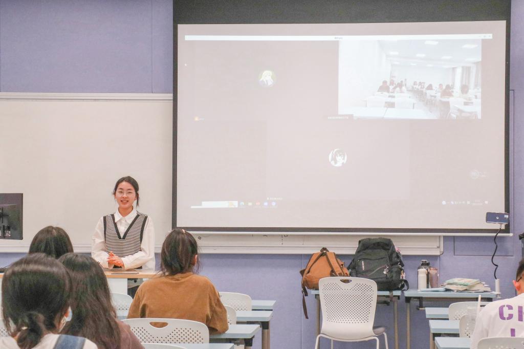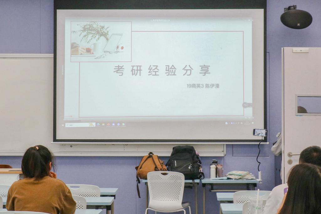 分享会上,陈伊漫分析了自身考研的原因,同时对如何择校这一问题做了详细讲解。她指出,要从专业学科评估水平、地理位置、考试题型、报录比这几个方面考虑。张玲美介绍了笔译各题型的复习方法,向同学们推荐了实用的APP以及复习资料。她表示,同学们要多练、多总结、多积累。最后,她们为考研的同学送上祝福,希望同学们都能考入自己满意的院校。