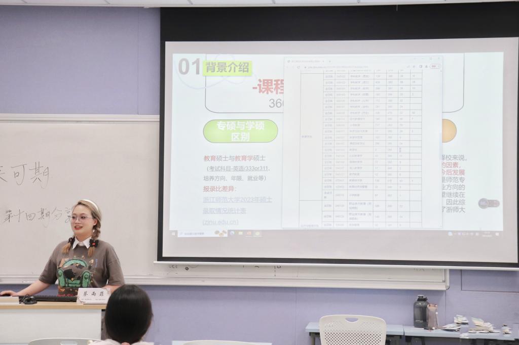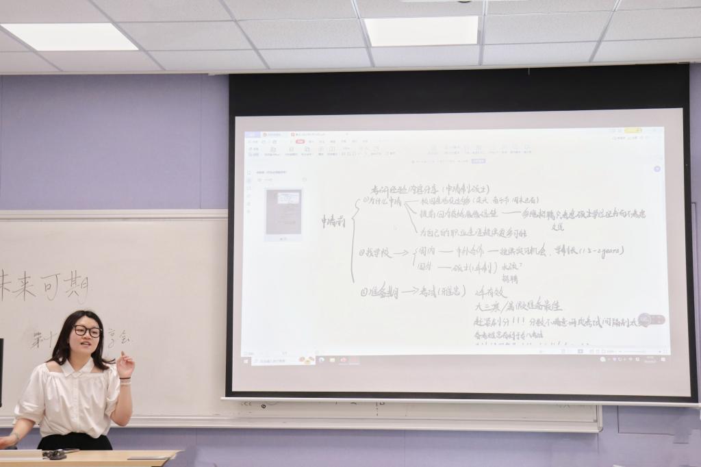 分享会上,金家伊以列提纲的方式逐层聚焦考研各阶段的重心。她解释了自己选择温州肯恩大学国际英语教学专业的初衷,并介绍了申请制硕士的特殊性。她建议计划申请该种硕士的同学应当尽早通过雅思考试并准备好学位成绩认证、个人陈述等申请材料。蔡雨菲则具体分析了“学硕”与“专硕”、国家命题与自命题之间的区别。她以所选择的课程与教学论专业为例,强调了明确考研初心的重要性,并就此介绍了自身的备考计划,推荐了备考资料。苏媚娜以其所考取的英语笔译专业为出发点,针对听讲同学的询问与需求,进行了详细地答复。她鼓励同学们把笔译当作一项技能,以此发展更多的可能性。