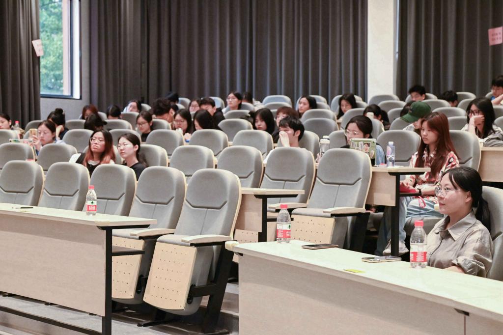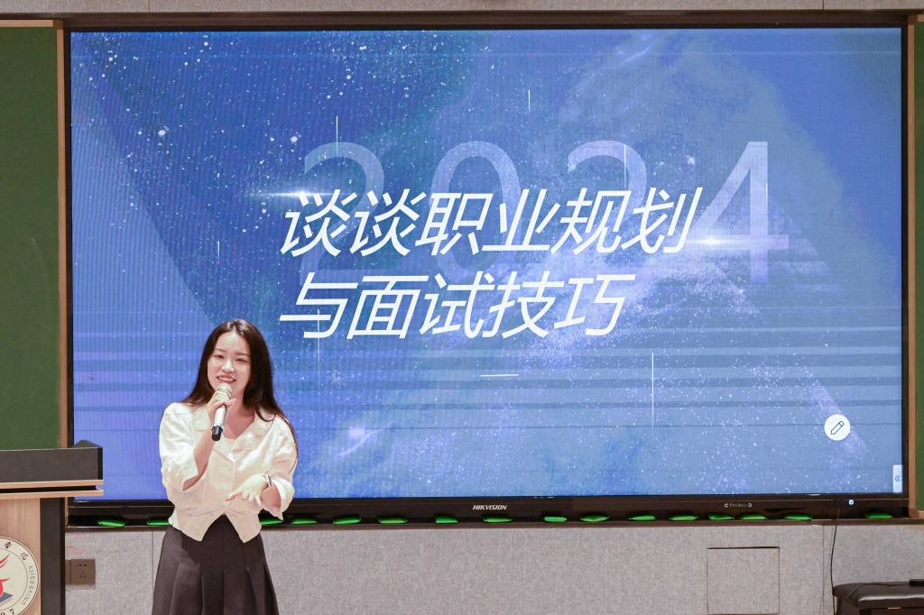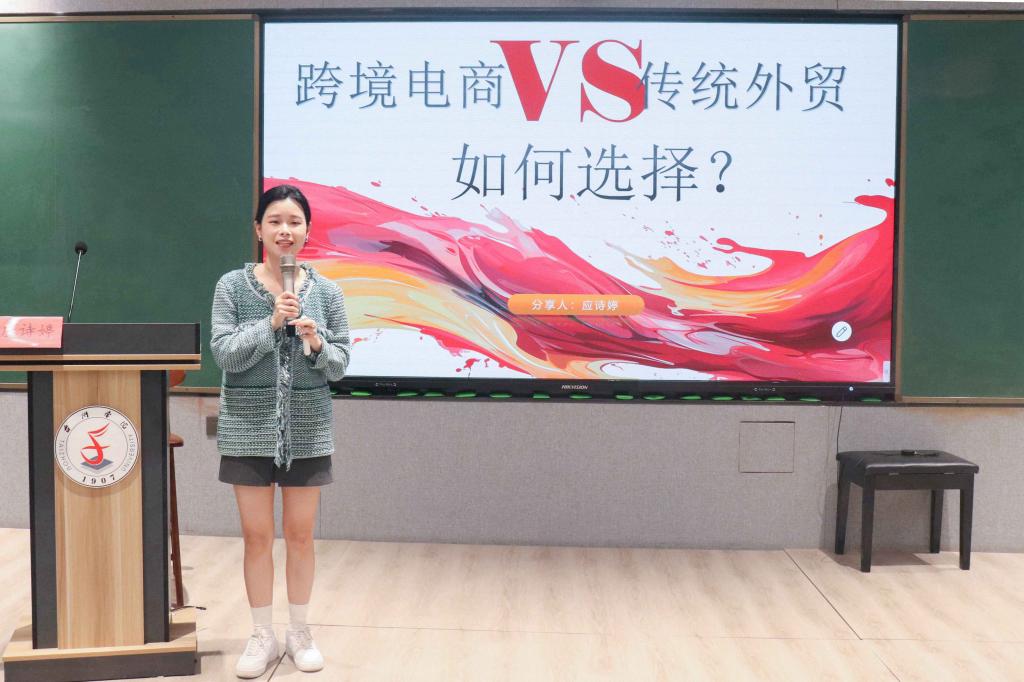 活动始,吴烨洲分享外贸流程和外贸从业经历。她认为外语能力非常重要,并鼓励同学们在校多学习多积累。强调,无论是商务谈判,还是处理文件和合同,外语能力都是关键。随后,应诗婷分享跨境电商和传统外贸的经验;指出要想在跨境电商领域取得成功,必须具备市场洞察力、应变能力以及国际经验。她认为失败是成功的必经之路,鼓励同学们勇于尝试和挑战。吴选俊则介绍了美企的职业环境,能力要求,职业晋升等。他强调,大家在校应夯实英语基础,注重跨文化能力的培养。他用自己的亲身经历说明,虽然我们起点不高,但只要自身足够努力,也可以跟985,211的高校毕业生同台竞技。最后,李可心从大厂人力资源角度出发,强调英语+能力的重要性,对职业规划,职场适应等做介绍。她鼓励同学们看到更多可能性,认为英语是打开世界的工具,职业的未来有无限可能。