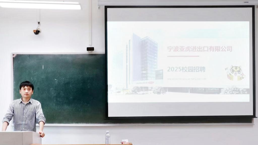 宣讲会伊始,周坤用两个宣传片展示了宁波的繁华宜居与公司的凝聚力。随后周坤就人才培养和业务流程两方面进行讲解。在人才培养和能力提升上,亚虎集团秉持“721”法则,以这三板斧作为各位同学提供提升自己能力的平台。而后周坤以翻页笔作为例子讲解了亚虎集团一条龙式的业务流程。最后周坤以流程图的形式阐明了招聘的流程与要求,并真诚祝福同学们能够拿到心仪的offer。