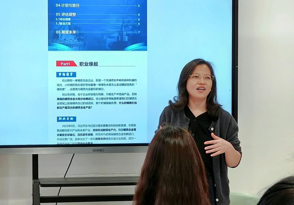 午茶会伊始,戴玲斐结合评分标准,详细介绍了职业生涯规划大赛的关键信息,包括赛事的时间安排、赛道要求等。参赛作品需围绕职业目标、职业认知、成长行动、评估调整等核心板块展开。戴玲斐分享了去年获得省赛银奖的作品,从职业目标的确定以及人职匹配的角度出发,清晰明了地提出员工参赛作品获奖的关键和突破口。