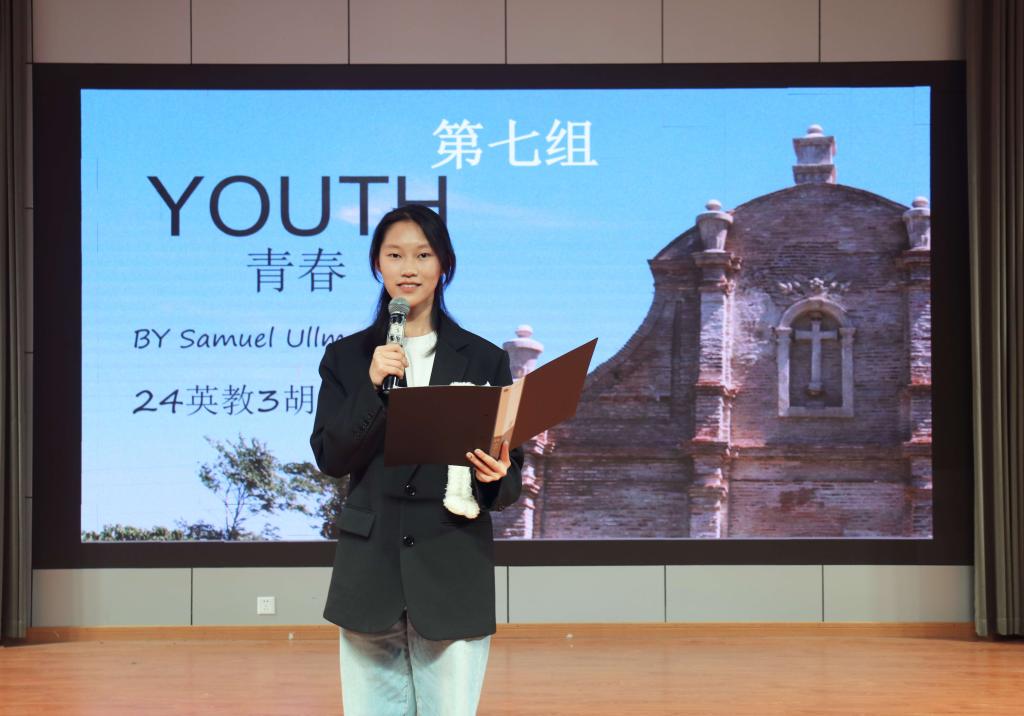 比赛正式开始,选手们依次自我介绍并表达对自身的期许。之后,各组选手依次上场,英语组的同学们以充满青春热情的声音致敬经典,展现了优越的学科素养和语音语调,将诗歌情感诠释得淋漓尽致。德语组的选手们将经典的诗歌以巧妙的方式连接,创造性地完成感情色彩的转变。每一位选手都将自身语言优势发挥到极致,让全场观众在思维的跳跃中感受经典诗歌的魅力。