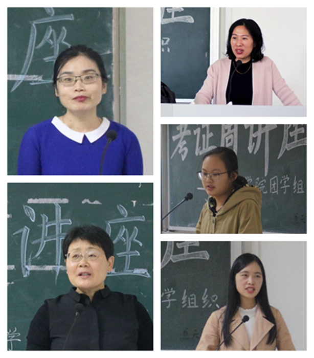 本次系列讲座以“你的梦想‘证’在起航”为主题,分三场进行。讲座分别着重介绍了英语专业员工在教团队格证书、国际商务单证员证书、剑桥商务英语证书、英语专业四级证书和上海中高级口译证书等考试的技巧与方法。王芬老师介绍了国际商务单证员在国际贸易中的职位工作,并就考试的相关内容着重说明和备考策略建议;吴锋针老师就教团队格证书的考试内容和题型做了深入分析;钱虹老师分析了考取剑桥商务英语证书(BEC)的重要意义,详细说明BEC考试的流程步骤与考试技巧,鼓励同学们积极报考、充分准备BEC考试。