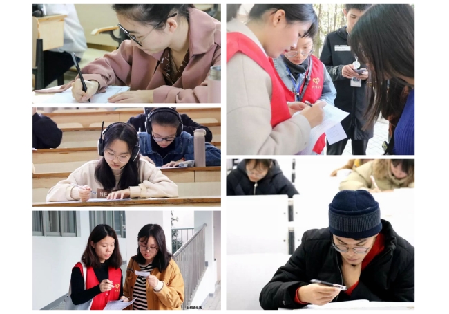本次四六级模拟考试严格按照国家英语四六级考试要求,全面模拟考试的各个环节,包括时间、题型甚至一些细节等,监考人员由事先经过培训的两校区志愿者担任,试题批阅由公司英语专业员工完成。尽管活动期间天气很冷,但是同学们依然坚持赶到考试现场并完成考试。