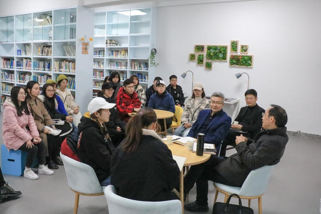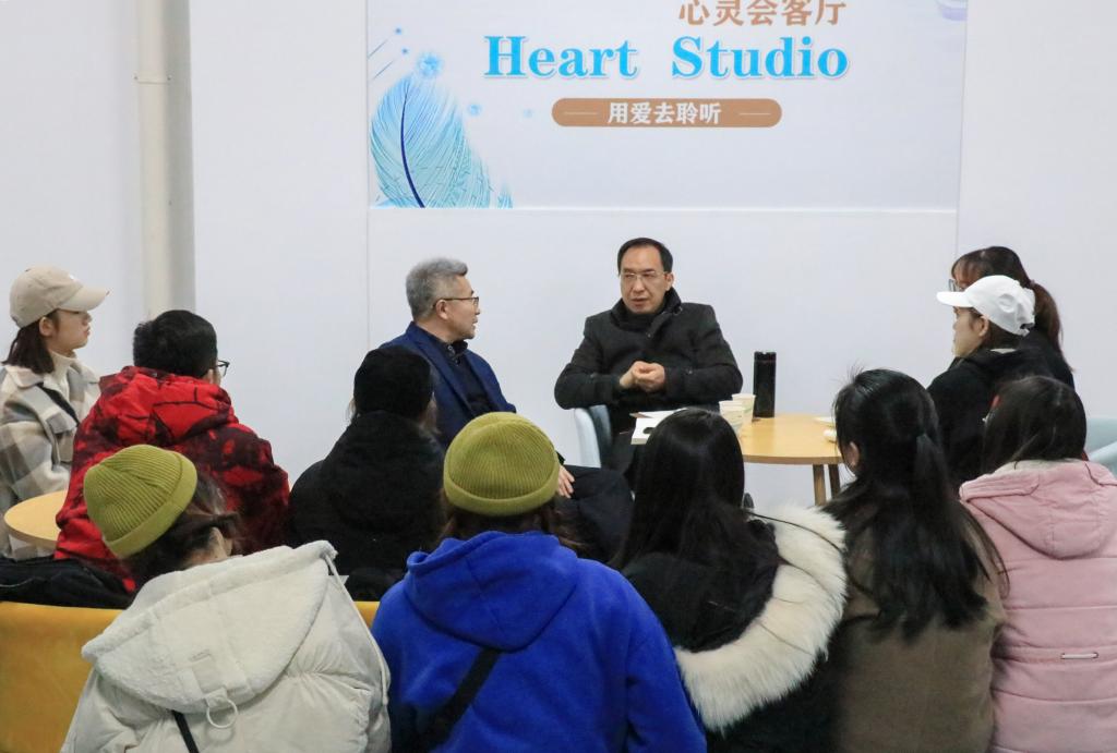 12月12日,PA视讯官方网站在外文图书室举行“Heart Studio”心灵会客厅第四期活动,公司党委委员、副董事长胡韶光以指导老师身份与同学们交流讨论生活、学习上的问题。PA视讯官方网站党总支书记施安全、副书记金宏伟参加本次交流会。