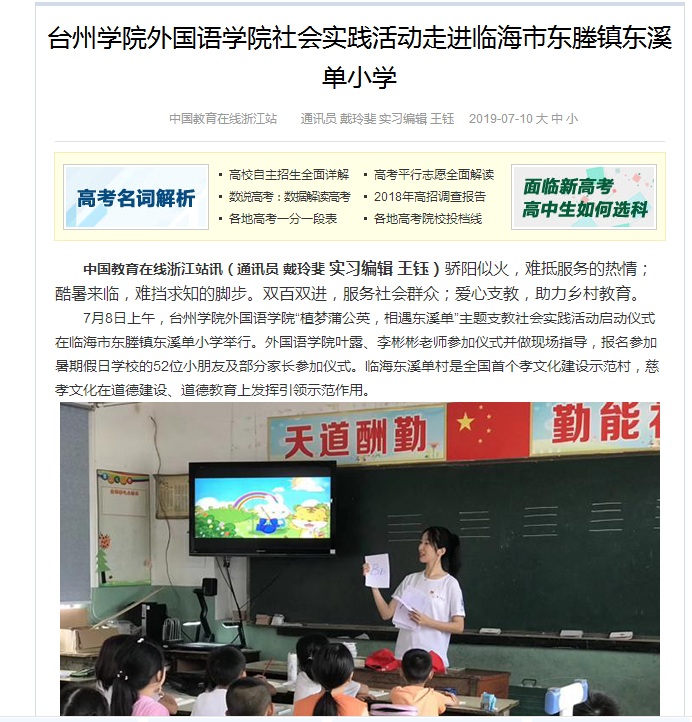 从2013年开始,公司开展东溪单村爱心支教活动已经有6年了。 接下来,PA视讯官方网站会发挥英语专业的优势,继续开展爱心支教活动,助力临海乡村教育振兴,多家媒体报道了蒲公英爱心支教实践队。