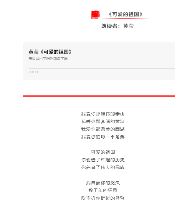 本次活动设一二三等奖,评比结果由大众投票选出。黄莹诵读的《可爱的祖国》凭借恰到好处的语感、充沛饱满的感情获得一等奖,王依纯、戴琪获二等奖,卢舒曼、王俊、金秀至、王雪钰获三等奖。