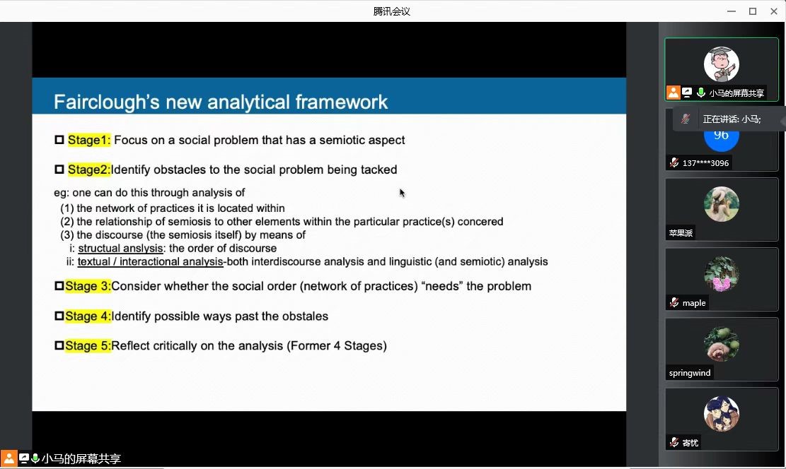 姚晓光老师首先介绍了批评话语分析研究领域内四位国际顶尖代表人物Norman Fairclough、Teun A. van Dijk、Ruth Wodak、Paul Chilton,以及他们各自的研究方向、理论框架和研究路径,并结合“五水共治调查问卷”“计划生育宣传标语”“耐克公司公关危机道歉信”等实例,重点阐释了其中三位学者研究路径的详细步骤,为大家提供了方法论指导。随后,姚老师带领大家阅读了发表在话语分析领域国际知名期刊Journalism和Discourse & Communication 上的两篇文章。从文章选题立意、研究方法与过程、英文写作风格等方面详细分析了国际期刊的特点,为以后大家向国际期刊投稿提供帮助。