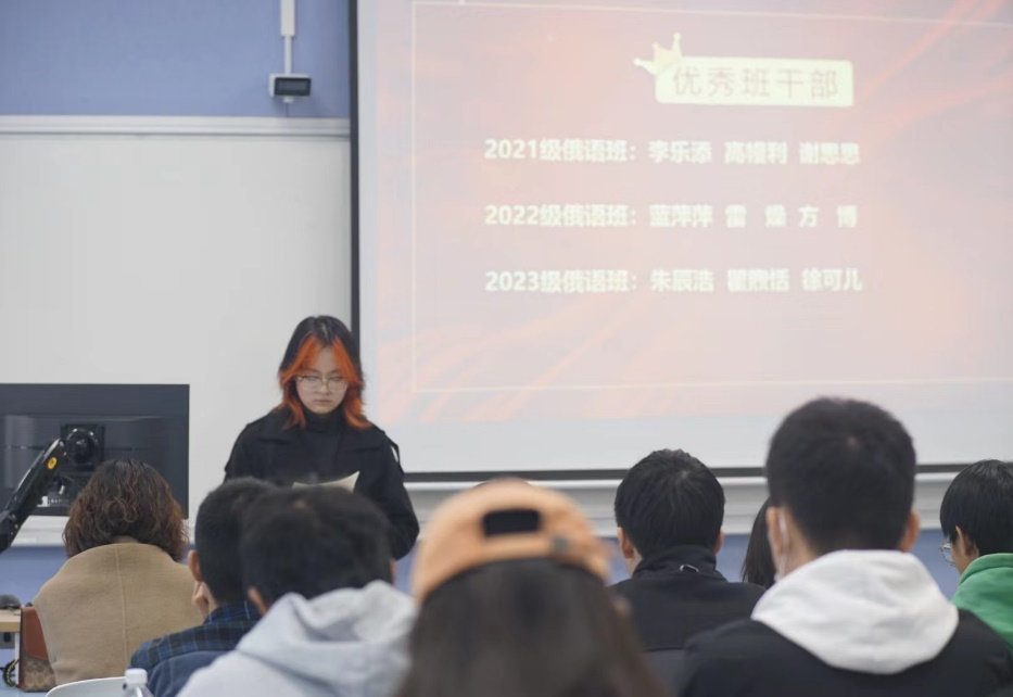 大会伊始,主持人介绍了出席本次活动的老师和员工,宣读了获奖名单。俄语系教师分别为获得“学习之星”“进步之星”“优秀班干部”的员工颁奖。