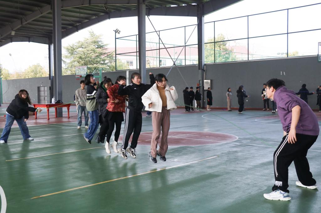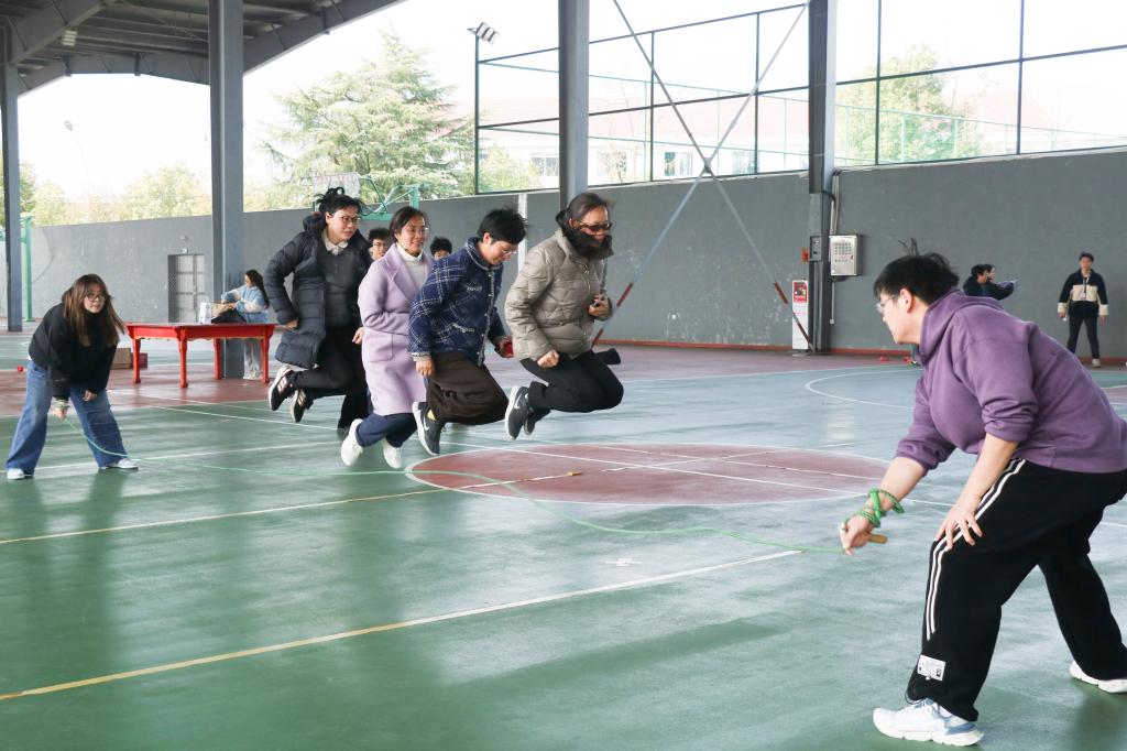 活动设有两项赛事:个人小绳和团体大绳。首先,师生进行为时一分钟的个人跳绳,展示灵活性和协调性,蕴含运动之美,绽放芳华风采。经过自由组队,团队各成员在规定时间内共同完成跳大绳的任务,展现出师生间强大的凝聚力和昂扬的精神面貌。跳绳翻飞,参与者们神采飞扬,轻盈似蝶。最后,师生合影留念,活动在一片欢声笑语中圆满落幕。