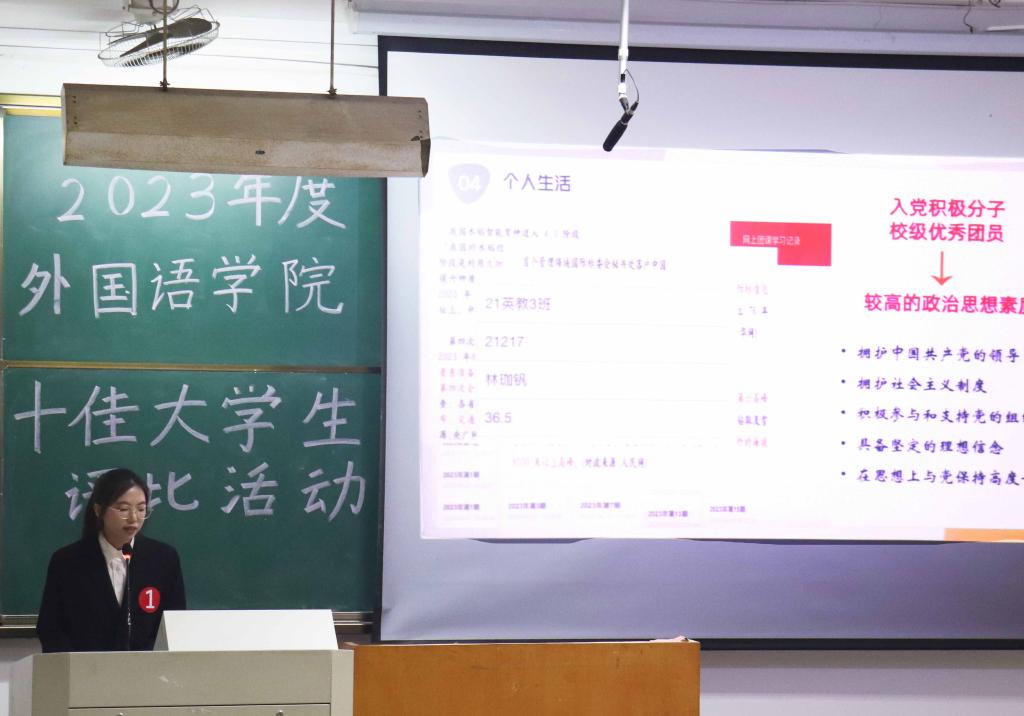 经公司前期初评,共确定17名候选人参评。17名候选人通过PPT演讲的方式,依次上台介绍自己的人生格言,并从学业成绩、考级考证、奖项荣誉、社会实践、思想品德、兴趣爱好等方面讲述自己的经历与成绩,全方位地展现了自身独具特色的优势。他们精彩的演讲让观众一睹外院学子在不同领域的风采,同时也赢得了热烈的掌声。