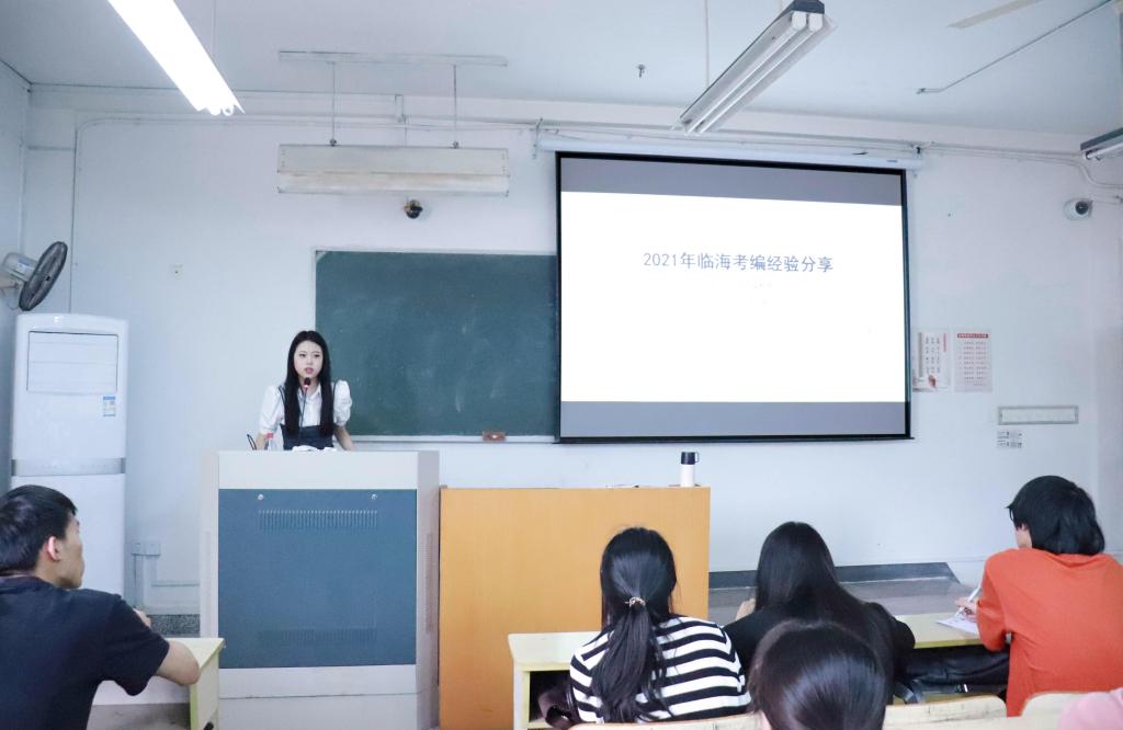接着,王瑶颖在现场分享了临海统考上岸经验。她首先强调要走好人生的分岔口,了解自己的职业方向,一旦确定路线就要笃信自己,坚持到底。随后,王瑶颖分享了教师招聘统招的相关信息、笔试面试的考试方向和内容、以及自己在备考中的学习方法和技巧等干货。她倡导备考过程中要劳逸结合,快乐学习,不要被其他因素所影响。