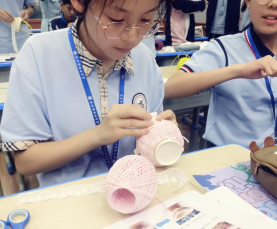 6月10日,刘富丽、陈真一行6人来到了椒江白云中学教授工作站,开展了题为“讲中国故事--非遗草编双语课进校园”的公益活动。党员教师曲洪为初二(九)、(十)两个班级的同学们带来了两节生动有趣、寓教于乐的英语手工课。课上,同学们不仅仅学会了如何利用纸杯、拉菲草等简单的材料制作草编花篮的工艺,也掌握了相关的英文词汇与句型。课后,同学们纷纷表示对于此类课程的喜爱及未来能够继续学习草编艺术的期望。