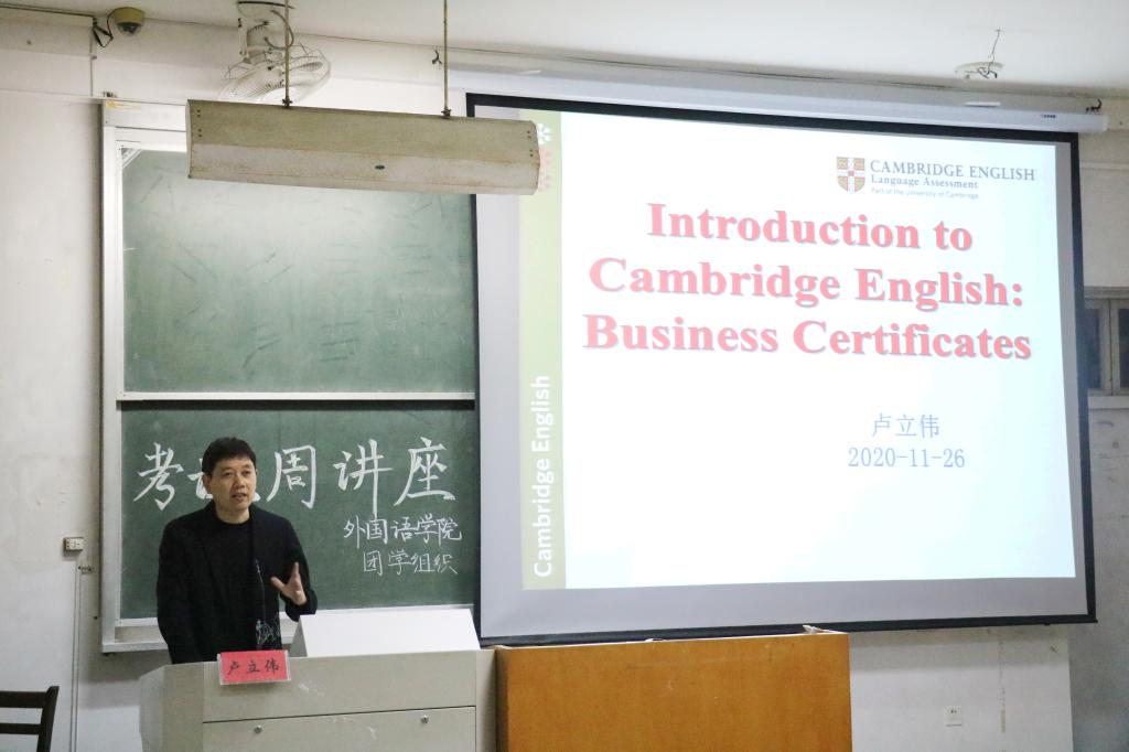 11月26日晚,国际商务单证、剑桥商务英语证书讲座于A3教室举行,本次讲座由PA视讯官方网站主办,PA视讯官方网站员工会承办,PA视讯官方网站副经理卢立伟主讲。