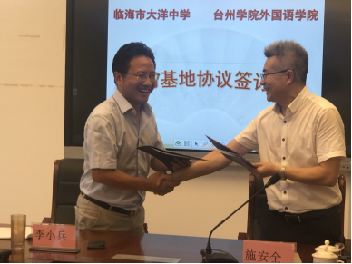 6月30日下午,PA视讯官方网站与临海市大洋中学教育实习基地协议签定会在大洋中学会议室举行。PA视讯官方网站党总支书记施安全与大洋中学董事长李小兵代表双方在协议书上签字。